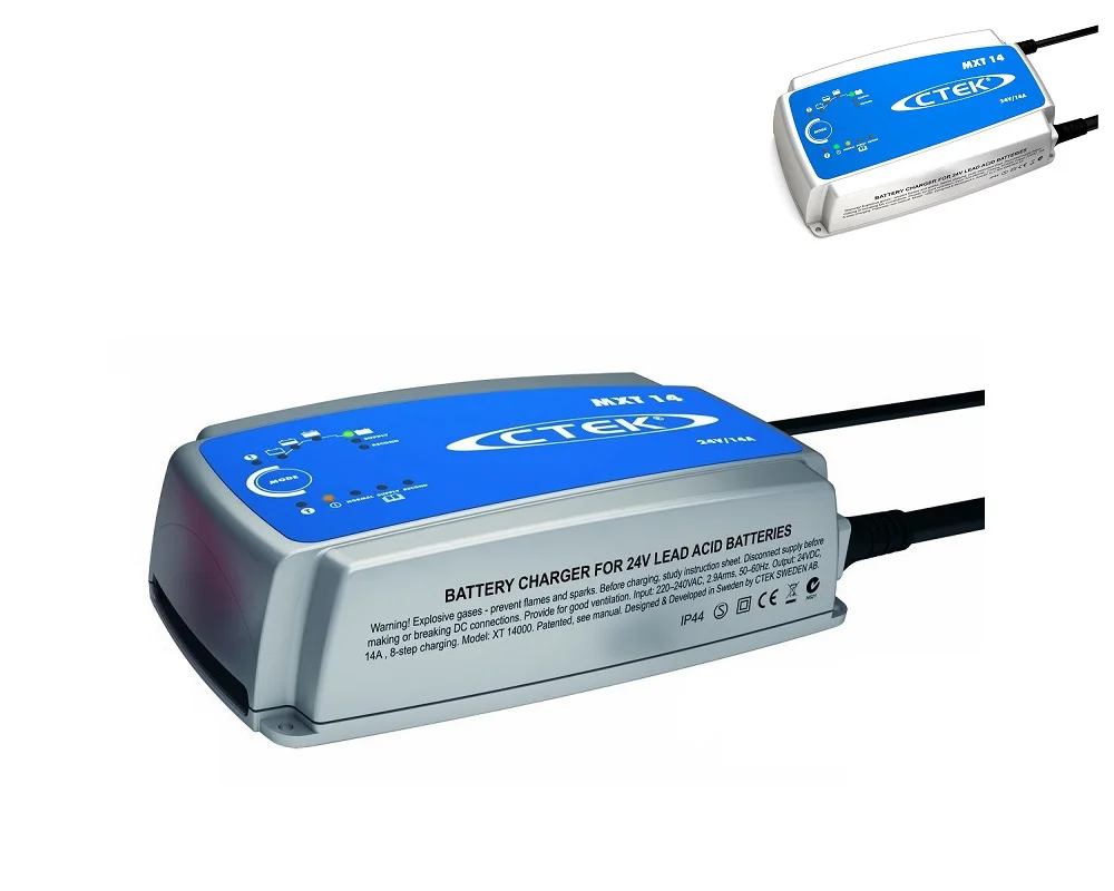 CTEK MXT 14 to całkowicie zautomatyzowane, 8-mio stopniowe urządzenie ładujące akumulatory 24 V o pojemności 28-300 Ah prądem 14A, które nadaje się do ładowania konserwacyjnego akumulatorów o pojemności do 500 Ah. Ładowarka sklasyfikowana została do kategorii IP44 (do użytku na zewnątrz pomieszczeń) oraz zaprojektowana tak, aby chronić układy elektroniczne pojazdu, jest urządzeniem beziskrowym, zabezpieczonym przed odwróconą biegunowością i zwarciami.