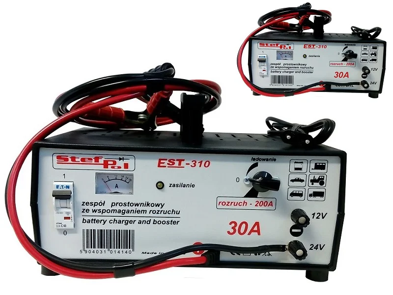 Zespół Prostownikowy EST – 310 jest przeznaczony do samoczynnego ładowania akumulatorów ołowiowo-kwasowych o napięciu 12V lub 24V i pojemności 70 ÷ 300Ah oraz do wspomagania rozruchu silnika.